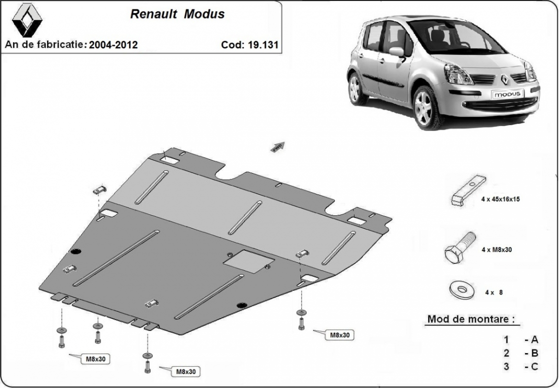 Skid plate for the protection of the: engine, gearbox . The skid plate is new and fits perfectly for all versions of Renault Modus manufactured between 2004 and 2012. Made out of 2 mm thick Steel plate. Screws, nuts, clips, all fastening accessories are included. All skid plates are powder coated to prevent corrosion. The exterior of the skid plate is provided with Steel reinforcements, which increases the resistance to impact. |