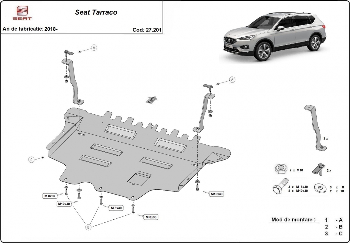 Skid plate for the protection of the: engine, gearbox, radiator . The skid plate is new and fits perfectly for all versions of Seat Tarraco manufactured between 2018 and 2026. It has an opening for the oil sump, so it's removal won't be necessary to change the oil. Made out of 2 mm thick Steel plate. Screws, nuts, clips, all fastening accessories are included. All skid plates are powder coated to prevent corrosion. The exterior of the skid plate is provided with Steel reinforcements, which increases the resistance to impact. |
