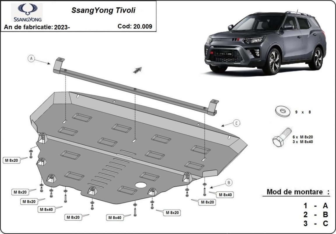 Skid plate for the protection of the: engine, gearbox, radiator . The skid plate is new and fits perfectly for all versions of SsangYong Tivoli manufactured between 2023 and 2026. Made out of 2 mm thick Steel plate. Screws, nuts, clips, all fastening accessories are included. All skid plates are powder coated to prevent corrosion. The exterior of the skid plate is provided with Steel reinforcements, which increases the resistance to impact. |