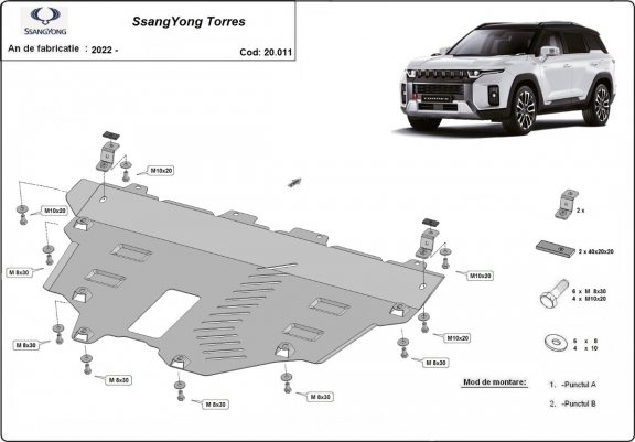 Skid plate for the protection of the: engine, gearbox, radiator . The skid plate is new and fits perfectly for all versions of Ssangyong Torres manufactured between 2022 and 2026. Made out of 2 mm thick Steel plate. Screws, nuts, clips, all fastening accessories are included. All skid plates are powder coated to prevent corrosion. The exterior of the skid plate is provided with Steel reinforcements, which increases the resistance to impact. |