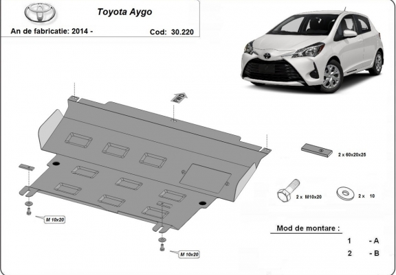 Skid plate for the protection of the: engine, gearbox, radiator . The skid plate is new and fits perfectly for all versions of Toyota Aygo AB40 manufactured between 2014 and 2022. It has an opening for the oil sump, so it's removal won't be necessary to change the oil. Made out of 2 mm thick Steel plate. Screws, nuts, clips, all fastening accessories are included. All skid plates are powder coated to prevent corrosion. The exterior of the skid plate is provided with Steel reinforcements, which increases the resistance to impact. |