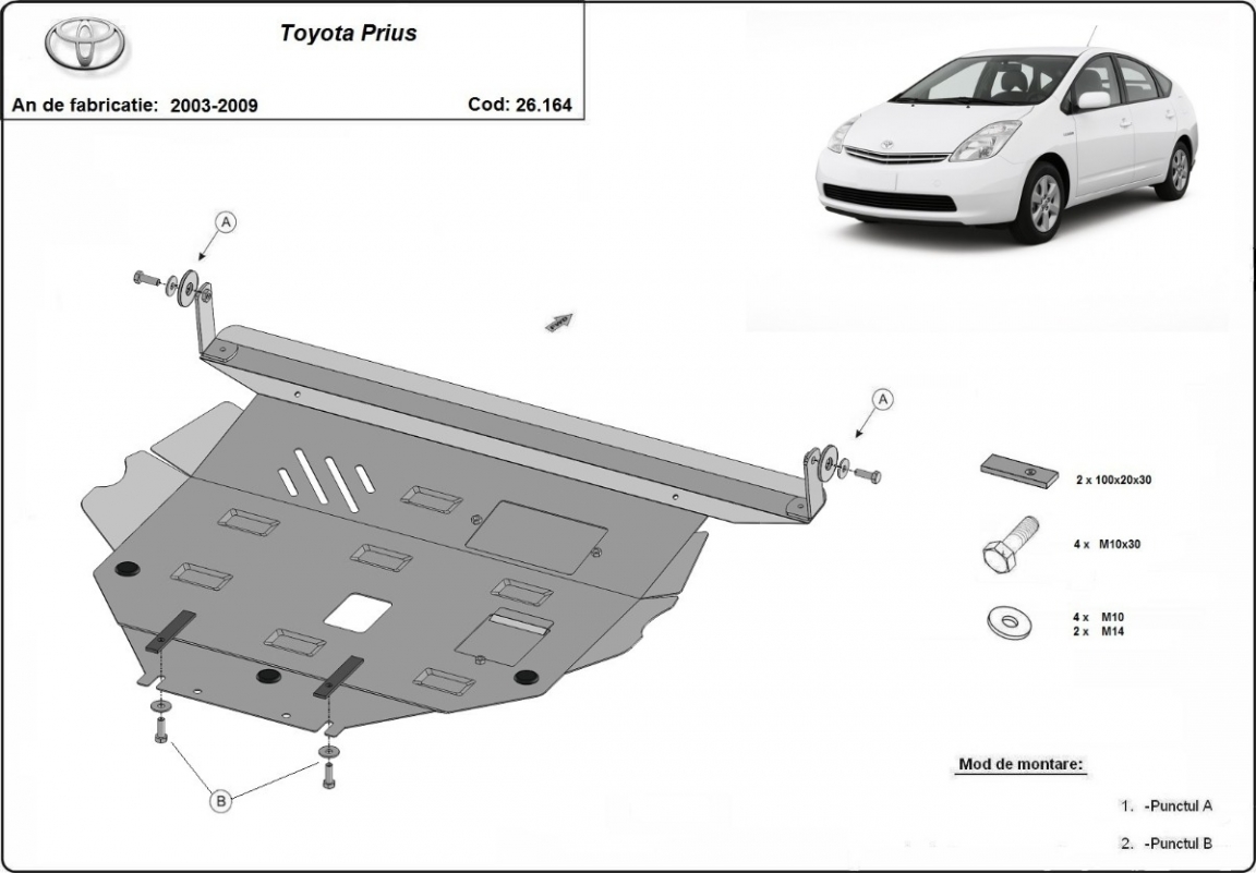 Skid plate for the protection of the: engine, gearbox, radiator . The skid plate is new and fits perfectly for all versions of Toyota Prius manufactured between 2003 and 2009. Made out of 2 mm thick Steel plate. Screws, nuts, clips, all fastening accessories are included. All skid plates are powder coated to prevent corrosion. The exterior of the skid plate is provided with Steel reinforcements, which increases the resistance to impact. |