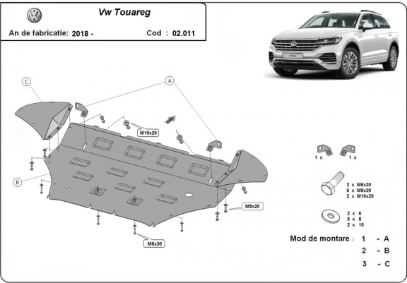 Skid plate for the protection of the: engine, radiator, front bumper . The skid plate is new and fits perfectly for all versions of Volkswagen Touareg manufactured between 2018 and 2026. Made out of 2 mm thick Steel plate. Screws, nuts, clips, all fastening accessories are included. All skid plates are powder coated to prevent corrosion. The exterior of the skid plate is provided with Steel reinforcements, which increases the resistance to impact. |