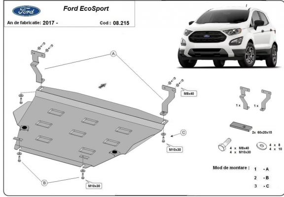 Skid plate for the protection of the: engine, gearbox, radiator . The skid plate is new and fits perfectly for all versions of Ford EcoSport manufactured between 2017 and 2026. Made out of 2 mm thick Steel plate. Screws, nuts, clips, all fastening accessories are included. All skid plates are powder coated to prevent corrosion. The exterior of the skid plate is provided with Steel reinforcements, which increases the resistance to impact. |